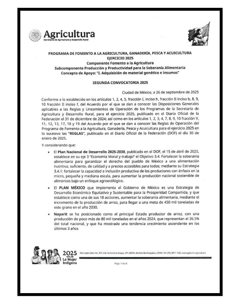 La Secretaría de Agricultura y Desarrollo Rural (SADER) federal anunció la convocatoria 2025 dirigida a productoras y productores de arroz en Nayarit, con el objetivo de fortalecer la productividad agrícola y la cadena agroalimentaria en el estado.