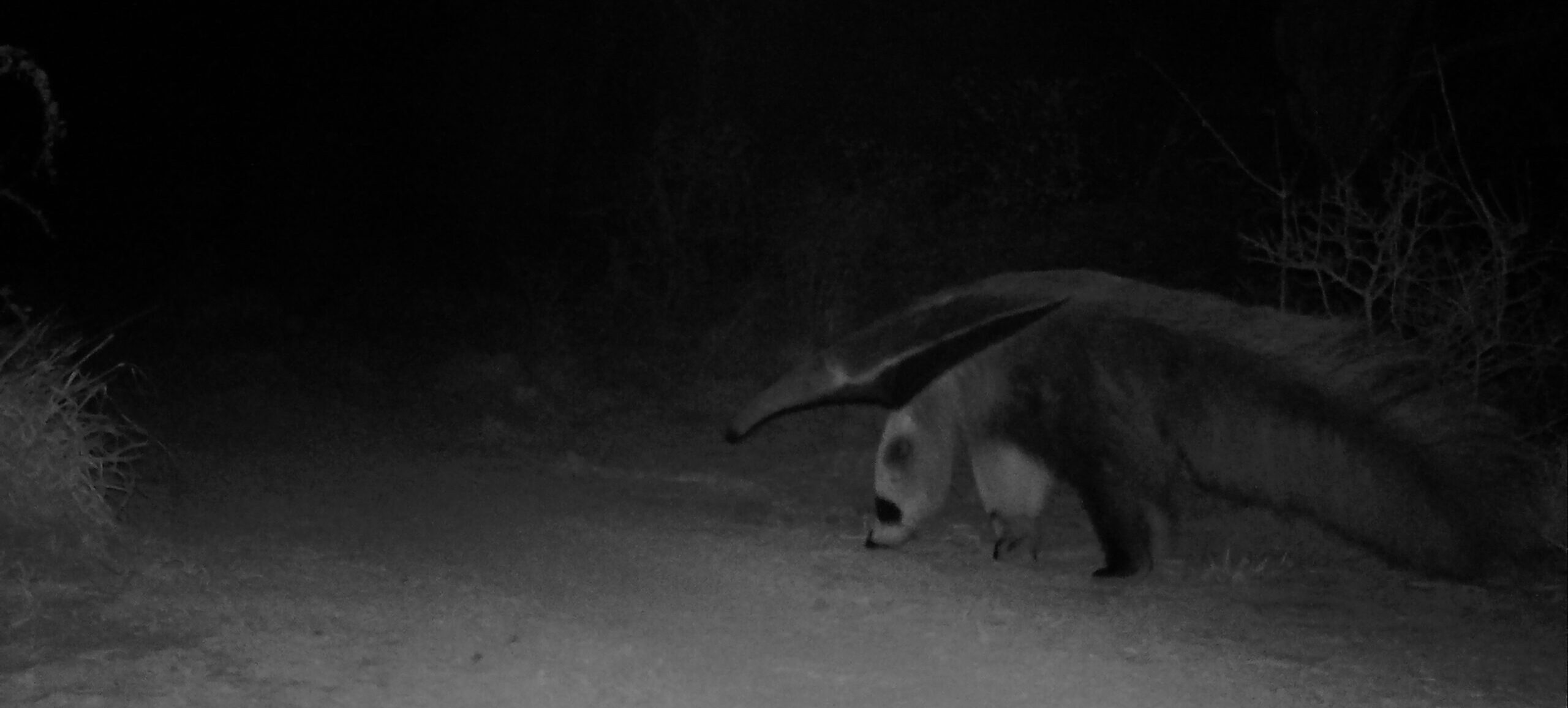 En la fototrampa, se ve a un oso hormiguero caminando. Generalmente lo hacen en las estancias, en medio del ganado, buscando alimento. Se han registrado casos de muertes del animal por encontrarse con perros de las estancias que los atacan. Foto: cortesía Andrea Weiler para Mongabay Latam