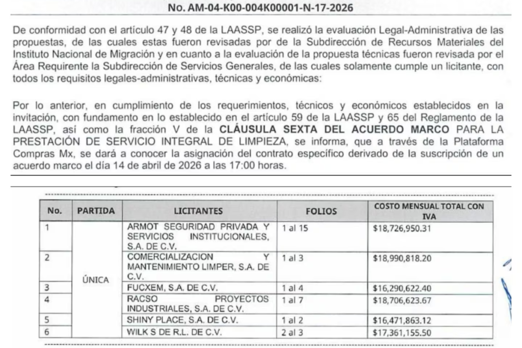 Empresarios que participaron en la licitación AM-04-K00-004K00001-N-17-2026, para brindar el servicio de limpieza a diversos inmuebles del Instituto Nacional de Migración, que dirige Sergio Salomón Céspedes Peregrina, alertan que el fallo no obedecería a cuestiones técnicas, sino más bien a intereses particulares.