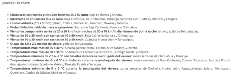 Entre el martes 30 de diciembre de 2025 y el jueves 1 de enero de 2026, en el noroeste y norte del país se mantendrán la probabilidad de lluvias y chubascos debido al flujo de humedad de un río atmosférico y las corrientes en chorro polar y subtropical, con pronóstico de lluvias puntuales fuertes en la península de Baja California y Sonora el martes y miércoles, y probable caída de nieve o agunaive en las sierras de Baja California y Sonora.