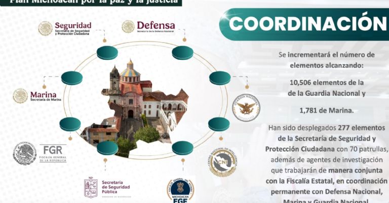 En materia de seguridad, Plan Michoaca´n por la Paz y la Justicia considera el fortalecimiento de la presencia de la Guardia Nacional, así como de la policía estatal y de la fiscalía del estado, con equipamiento, capacitacio´n y acciones especi´ficas para que cada elemento policial tenga las herramientas y la confianza para servir con honor al pueblo michoacano. Lo anterior, bajo la coordinación y supervisión del gobierno federal.