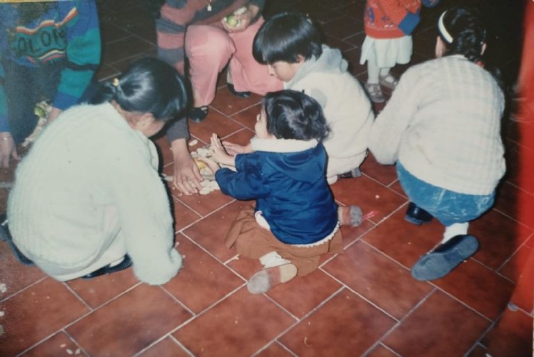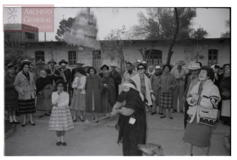 “Entonces sí había que pegarle fuerte porque era un cartón y dentro iba la olla de barro, y pasábamos todos los niños a pegarle. Muchas veces sin vendarnos los ojos y a pegarle duro al cartón. Ya cuando el cartón desaparecía, pues ya quedaba la piñata libre, y ahora sí, con los ojos vendados, unas tres vueltecitas para marearnos y a pegarle a la piñata. Cuando se rompía la olla de barro, caían la fruta más que nada: la cañita, la jícama, naranjas, cacahuates, tejocotes, fruta que aunque yo alcanzara dos o tres frutitas, me las comía con mucho gusto”, recuerda.