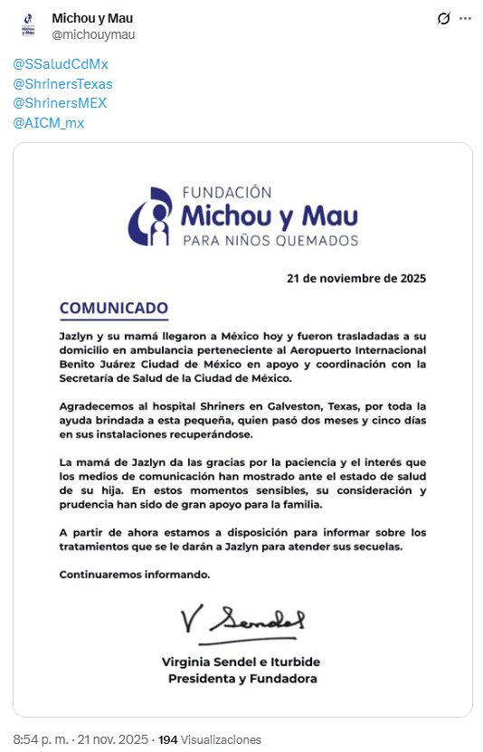 Tras el accidente, Jazlyn fue atendida inicialmente en el Centro Médico Siglo XXI, donde fue estabilizada antes de ser autorizada su transferencia aérea a Estados Unidos para continuar su tratamiento.