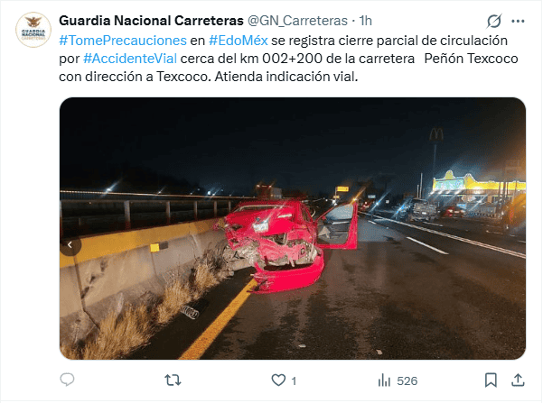 • En Estado de México se registra cierre parcial de circulación por accidente vial, cerca del km 043+800 de la carretera México (ENT. Constituyentes)/ Toluca (Lerma).