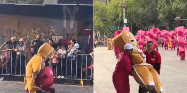 En el video viral se puede ver a la botarga de galleta de jengibre caminar de manera exhausta y poco a poco comenzar a tropezar. Una persona rápidamente se acercó a asistir al personaje, sin embargo, rápidamente se observa cómo se vence, cayendo descuidadamente sobre el piso.