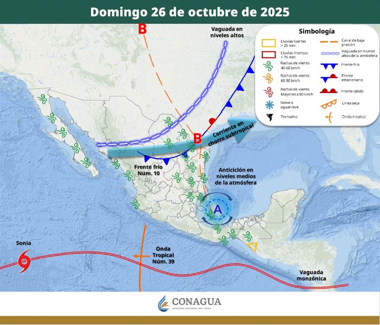 En los últimos días, México se ha visto influido por una serie de fenómenos atmosféricos que están cambiando el clima de diversas regiones. Por un lado, se observa la entrada de sistemas frontales que avanzan desde el norte del país y que provocan vientos intensos, descenso de temperaturas y mayor nubosidad.