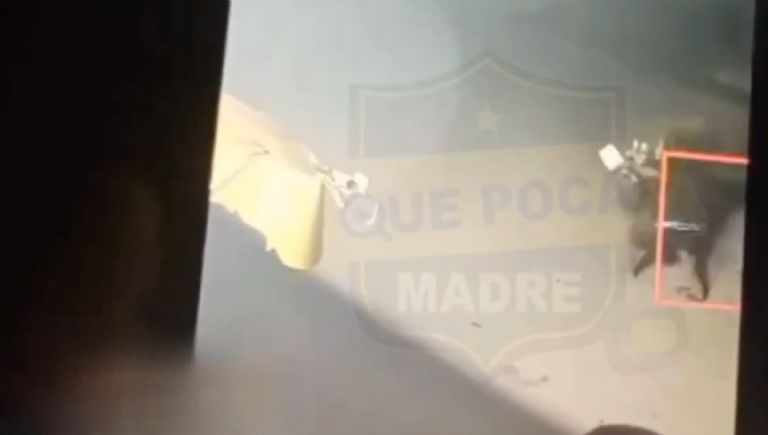El sujeto, al cual no se le logra ver el rostro, lleva algo entre las manos. Una segunda cámara -que capta una toma más cercana a la figura masculina– tampoco logra grabar la cara de la persona que camina de manera extraña.