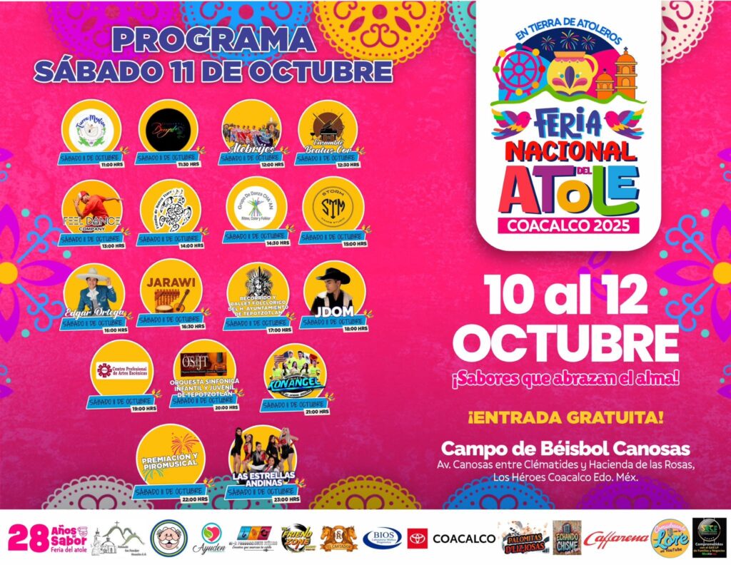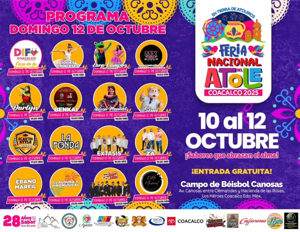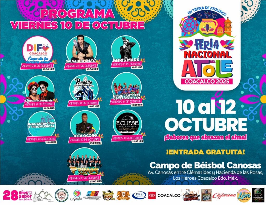 La Feria del Atole 2025 se llevará a cabo del 10 al 12 de octubre, a partir de las 11:00 horas. La cita es en el Campo de Béisbol Canosas, ubicado en Manzana 011, colonia Los Héroes Coacalco, municipio de San Francisco Coacalco, Edomex.