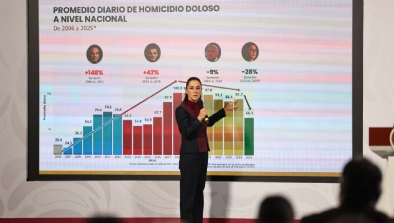 Destacó que, de 2006, último año de Vicente Fox, al 2012, último de Felipe Calderón, los homicidios dolosos aumentaron en 148 por ciento, como resultado de la llamada “guerra contra el narco” y de igual forma, del último año de Calderón al último de Enrique Peña Nieto, incrementaron en 42 por ciento. Mientras que, del último año de Peña al último del expresidente Andrés Manuel López Obrador en 2024, la reducción en este delito fue de 9 por ciento. Y al 31 de octubre de 2025, la disminución es del 28 por ciento. Por ello, puntualizó, con la Cuarta Transformación cambió la estrategia y se están dando resultados.