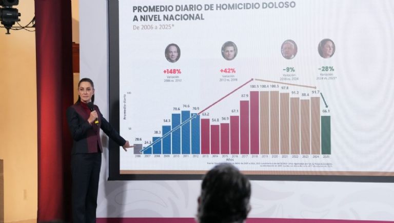 La Presidenta de México, Claudia Sheinbaum Pardo, resaltó la disminución de 37 por ciento en el promedio diario de homicidios dolosos, de septiembre de 2024 a octubre de 2025, al pasar de un promedio de 86.9 víctimas diarias a 54.5, respectivamente, es decir, hubo 32 homicidios dolosos menos diarios.