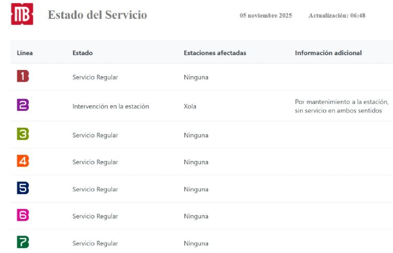 Durante la mañana de este miércoles 5 de noviembre, el Metrobús de la Ciudad de México informó en su reporte de las 6:48 horas que 6 Líneas operan con normalidad y sin inconvenientes, mientras que la estación Xola de la Línea 2 se encuentra cerrada por trabajos de mantenimiento. En la Línea 4 ruta sur, ya se restableció el servicio.