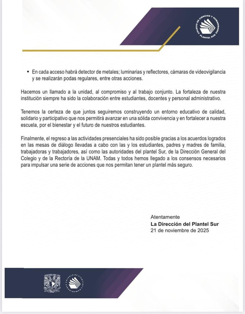 En el comunicado emitido, la Dirección del CCH Sur destaca que la colaboración entre estudiantes, docentes, personal administrativo, autoridades del Colegio de Ciencias y Humanidades y la Rectoría de la UNAM ha sido clave para acordar las acciones que ahora se implementan.