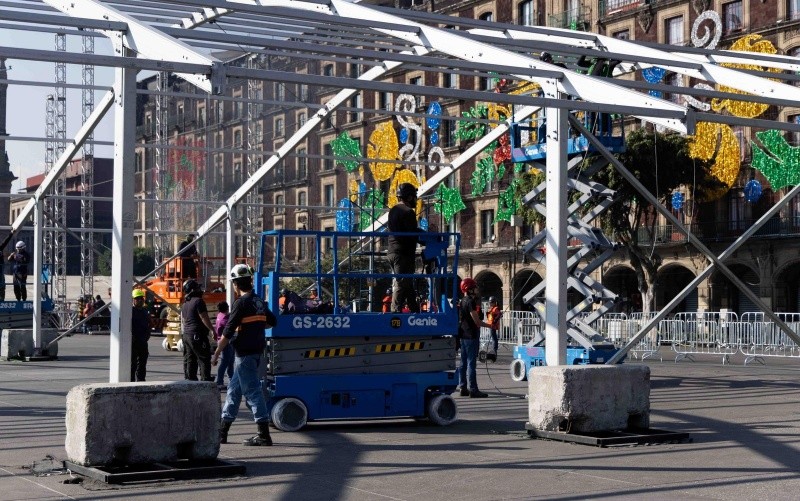 Instalación de las estructuras de la Verbena Navideña que se realizará en el Zócalo de la Ciudad de México. SUN/H. Salvador