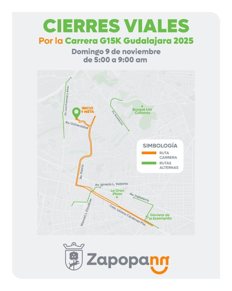 El próximo domingo habrá modificaciones en las vialidades de la ZMG, con el objetivo de que las y los corredores de la Carrera G15K Guadalajara 2025 puedan participar de forma segura en el evento.