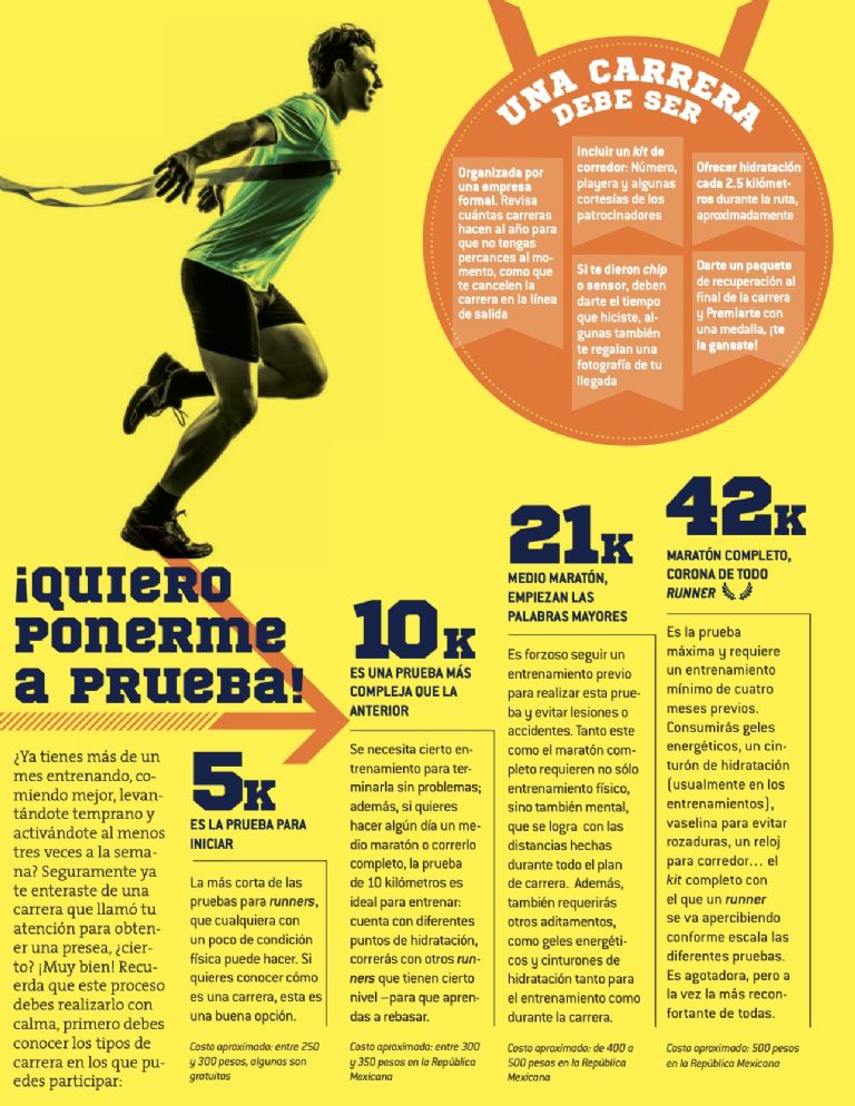 - La carrera debe ser organizada por una empresa formal. Revisa cuántas carreras hacen al año para que no tengas percances al momento, como que te cancelen la carrera en la línea de salida.