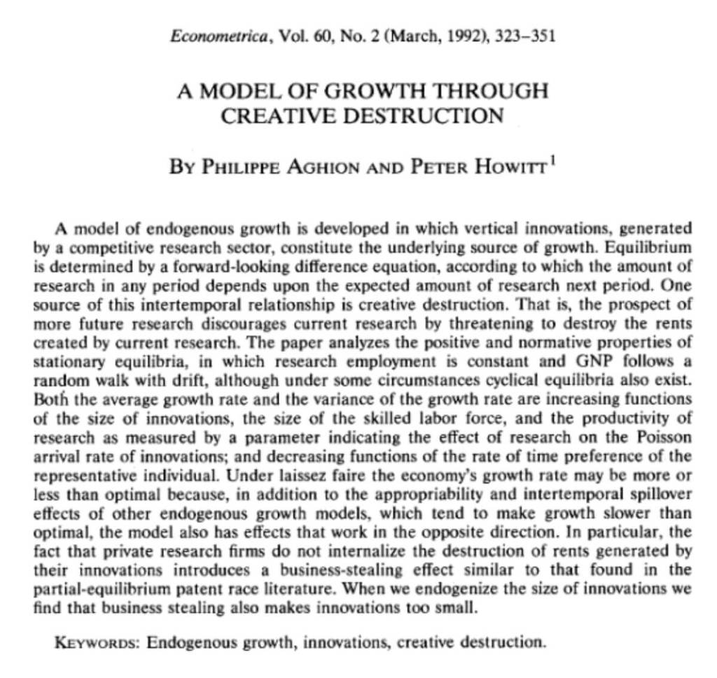 • Aghion, Philippe, and Peter Howitt. A Model of Growth through Creative Destruction. Econometrica, vol. 60, no. 2, March 1992, pp. 323–351. DOI: 10.2307/2951599.