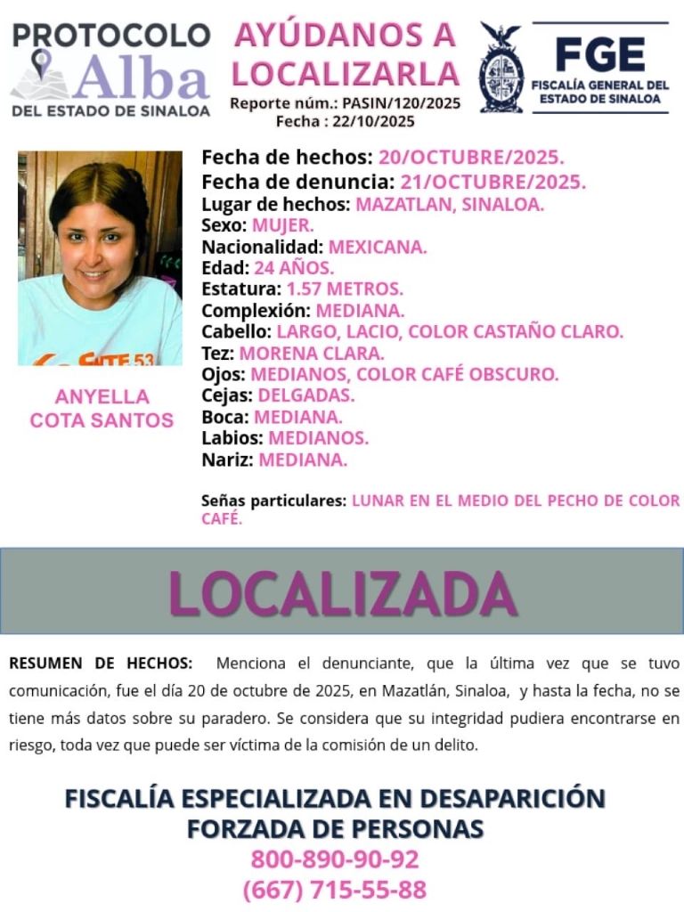 Autoridades de Sinaloa investigan el feminicidio de la maestra de preescolar Anyella Cota Santos, de 24 años, quien fue reportada como desaparecida el pasado lunes 20 de octubre y su cuerpo fue encontrado, sin vida, dos días más tarde. De acuerdo con los primeros reportes, la docente salió de su domicilio y jamás regresó, lo que llevó a sus seres queridos a reportar la desaparición y emitir una ficha de búsqueda.