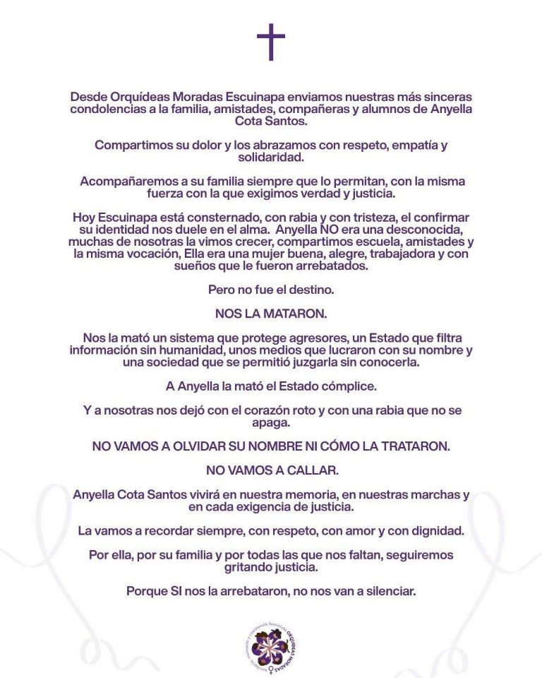 En otro fragmento del comunicado, el colectivo feminista aseguró que la maestra era conocida y muy querida por su comunidad: “hoy Escuinapa está consternado, con rabia y tristeza. Confirmar su identidad nos duele en el alma. Anyella no era una desconocida; muchas de nosotras la vimos crecer, compartimos escuela, amistades y la misma vocación. Era una mujer buena, alegre, trabajadora y con sueños que le fueron arrebatados.”