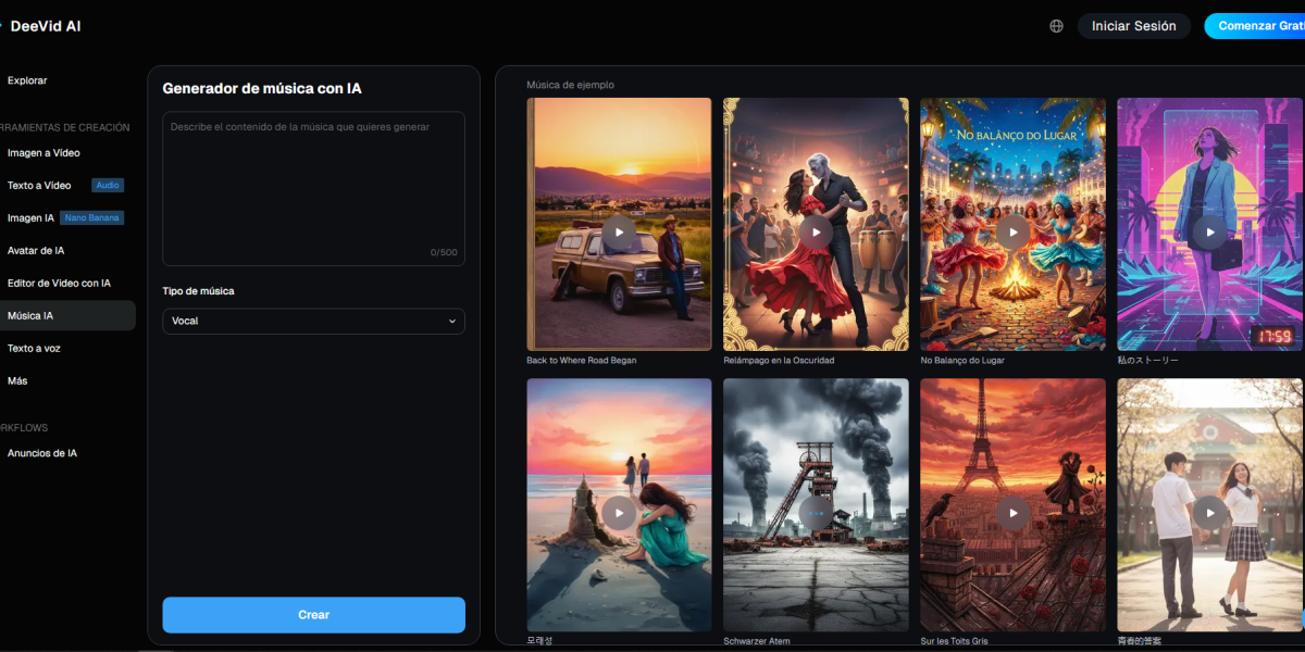 El canciones ia de DeeVid envuelve esa capacidad en un flujo de trabajo diseñado para profesionales de marketing y creadores, no para aficionados. En vez de ajustar archivos MIDI o pelearse con un DAW, un brand manager puede describir un briefing —“intro latina enérgica para un reel de lanzamiento de producto”, “base lo-fi de fondo para un tutorial de tres minutos”, “estribillo pop épico para un claim de campaña”— y obtener varias opciones, limpias en derechos, en cuestión de minutos.