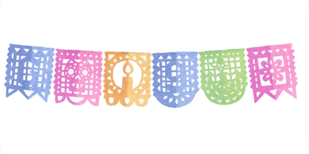 La ilustración muestra una guirnalda de papel picado en tonos pastel (azul, rosa, naranja, verde y morado) con figuras típicas de esta festividad, como calaveras, velas, flores y patrones artesanales, elementos que evocan las ofrendas colocadas en los hogares mexicanos.