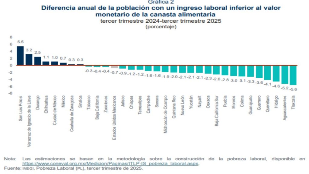 El Inegi indicó que la pobreza laboral disminuyó en 24 entidades del país durante el tercer trimestre del 2025, en comparación con el mismo periodo, pero del 2024.