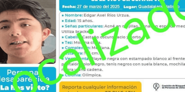 Este jueves, la vicefiscal Especializada en Personas Desaparecidas, Blanca Trujillo, dio a conocer más detalles sobre la desaparición y localización de Edgar Axel, de 15 años, alumno de la escuela Preparatoria Vocacional y quien fue visto por última vez el pasado 27 de marzo en la Colonia Olímpica de Guadalajara.