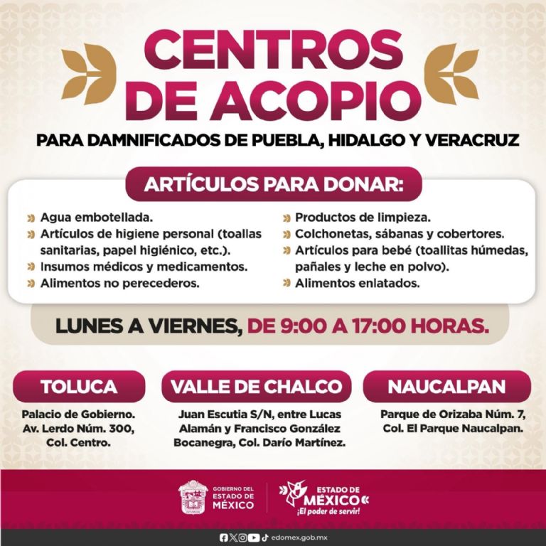 Adrián Hernández Romero, coordinador General de Protección Civil y Gestión Integral del Riesgo estatal, informó que la gobernadora Delfina Gómez Álvarez habilitó tres centros de acopio en el Estado de México para recolectar ayuda para los damnificados de Puebla, Hidalgo y Veracruz tras las lluvias extraordinarias que azotaron el pasado fin de semana e indicó las ubicaciones de donde se encuentran instalados en: