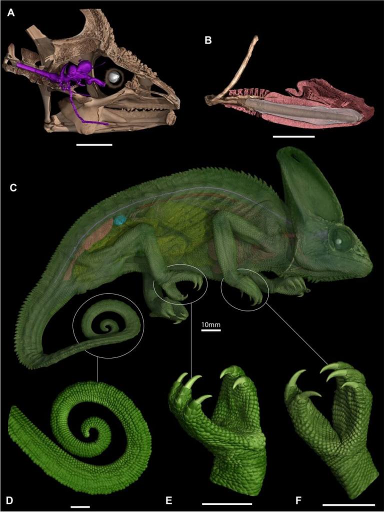 Esto fue posible gracias al uso de escáneres de tomografía computarizada con contraste, una técnica que permite observar tejidos blandos sin necesidad de diseccionar. La investigación se basó en el análisis de 34 especies de reptiles escamosos, entre ellos tres especies de camaleones muy distintas en tamaño y hábitat. Los autores describen que, en todos los camaleones analizados, los nervios que conectan los ojos con el cerebro recorren un camino enrevesado, lleno de vueltas y ángulos de 90 grados, en lugar de seguir una línea recta como en la mayoría de los vertebrados.