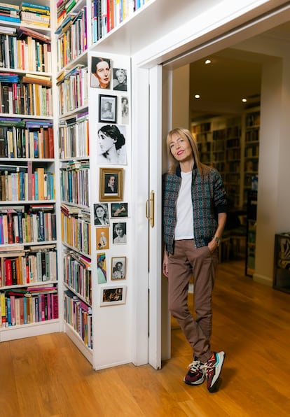 La estancia huele especialmente bien, hay piezas de arte mexicanas, románicas y prerrománicas heredadas de su madre, fotografías de escritoras y artistas pegadas en los laterales de una de las librerías y hay, sobre todo, libros, muchos libros, la mayoría en inglés. En el comedor y en el salón se reparten los ensayos, las novelas y, en general, los libros de filosofía de autores masculinos y femeninos. Hay casi cuatro estanterías dedicadas a la novelista británica Jane Austen: a sus novelas, los libros que leía, los que hablan de ella, los que la citan mínimamente. “Pero tienes que ver mi biblioteca feminista”, apunta Amparo con orgullo y complicidad.