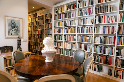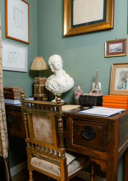 En una estancia adyacente al salón, el imponente gineceo: “Teoría feminista, poesía, lesbianismo, teoría jurídica, cartas y diarios, autobiografías y biografías, novelas, sufragismo, autoras contemporáneas, lo que han dicho los hombres sobre las mujeres…”. Y toda una columna dedicada a Virginia Woolf. En el centro, un sofá rojo coral y, a la izquierda, una pequeña mesa de madera con las cartas de Jane Austen publicadas en inglés, el diccionario María Moliner y bloques de post-its. “Esos tres tomos los acabo de comprar. Son de 1796 y son la novela Camilla, de Frances Burney, una autora que le encantaba a Austen”. Junto a ella, una pequeña silla de salón de baile suizo del siglo XVIII. “La compré en Lucerna (Suiza) durante una gira de Dover. Por aquel entonces viajábamos en un autobús con camas. Llegábamos a las ciudades por la mañana, desayunábamos en la sala y hacíamos la prueba de sonido. Lucerna es muy pequeña, cerca de la sala había un anticuario y allí la vi, la compré y la metimos en el autobús como pudimos”.