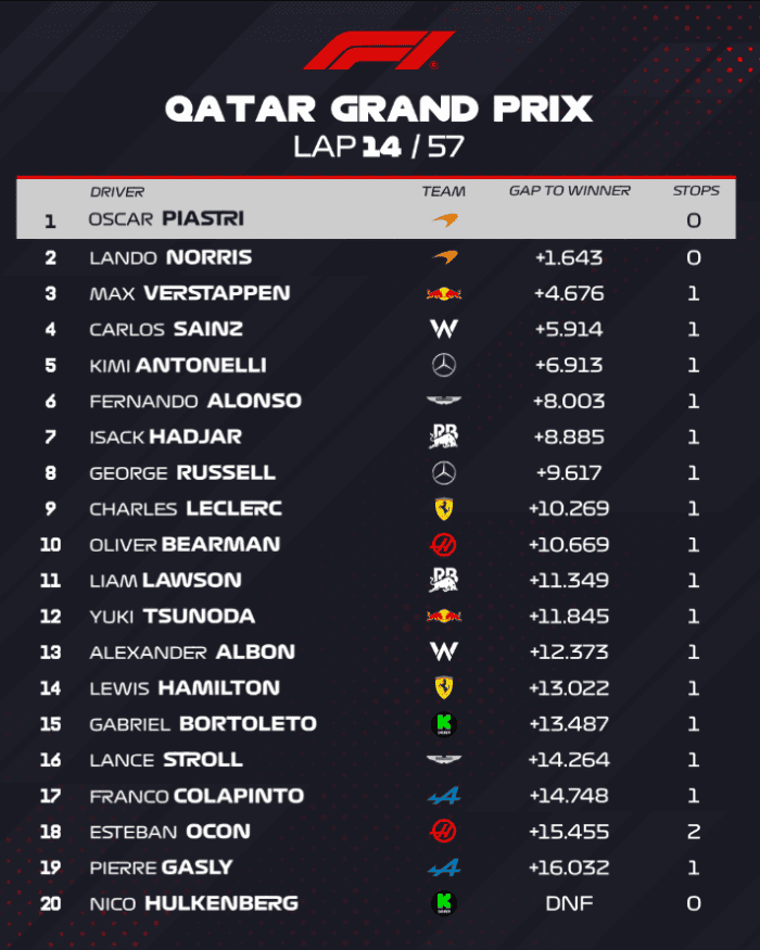 En la vuelta 14, Piastri sigue al frente, seguido por Norris y Verstappen.