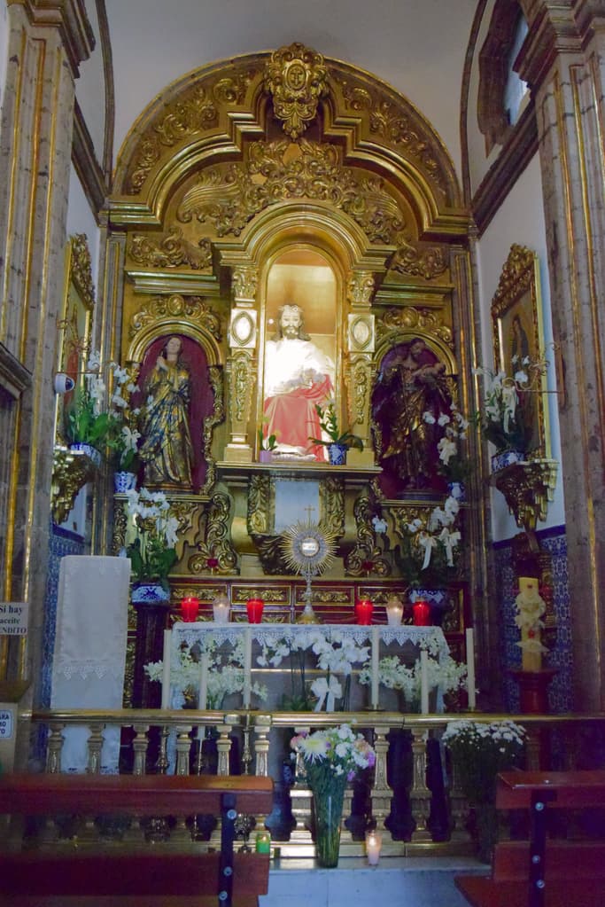 Dentro de la iglesia más pequeña de la CDMX, el bullicio de la Merced se aleja por la música que se reproduce a través de una bocina escondida en el coro de la mini iglesia. Algunas personas entran curiosas por su tamaño y arquitectura, observan fascinadas y aprovechan para descansar en sus banquitas. Otras llegan cargadas de paquetes pesados, los dejan caer a un lado y después se arrodillan para dar gracias, persignarse y dejar su limosna.