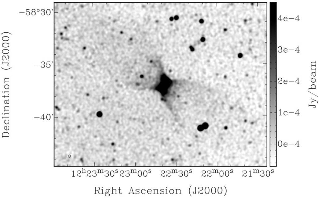 Los autores describen cómo el flujo “se eleva verticalmente desde el disco estelar, luego se ensancha lateralmente mientras continúa su expansión hacia arriba”, con un ángulo de apertura de aproximadamente 30 grados en ambos lados del disco . En las imágenes de radio, también se observan alas en forma de X que emergen desde el disco grueso de la galaxia y se extienden por los bordes de la estructura, lo que refuerza su forma característica.