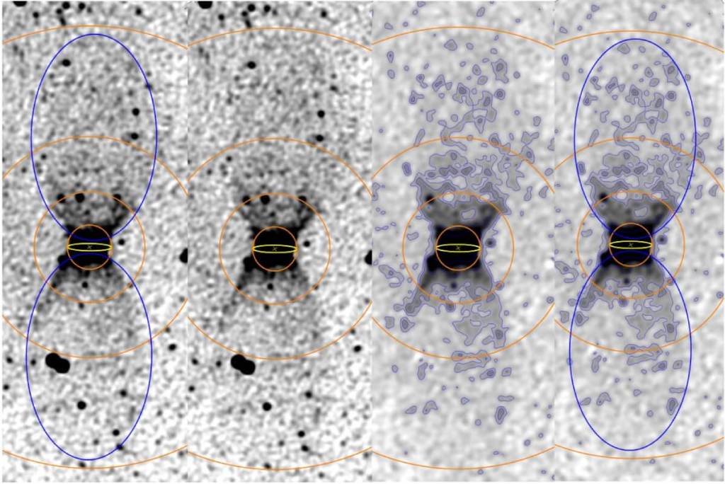 El aspecto de la estructura es quizás lo más llamativo. Se trata de una burbuja doble con forma de reloj de arena, hueca por dentro y más brillante en sus bordes, una característica conocida como limb-brightening o “brillo de borde”. La parte central, donde se encuentra el disco estelar, funciona como la “cintura” del reloj. Desde ahí, el gas se expande hacia el halo galáctico, formando una figura casi perfectamente simétrica.