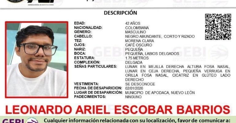 Leonardo Ariel Escobar fue reportado desaparecido desde el pasado enero, luego de que sus familiares recibieran alarmantes mensajes sobre su posible estado de salud. La Secretaría de Seguridad de Apodaca confirmó que fue detenido el pasado 2 de enero por alterar el orden público. Horas después, el profesor de origen colombiano, acudió al Aeropuerto Internacional de Monterrey para regresar a su hogar, pero perdió el contacto con sus seres queridos.