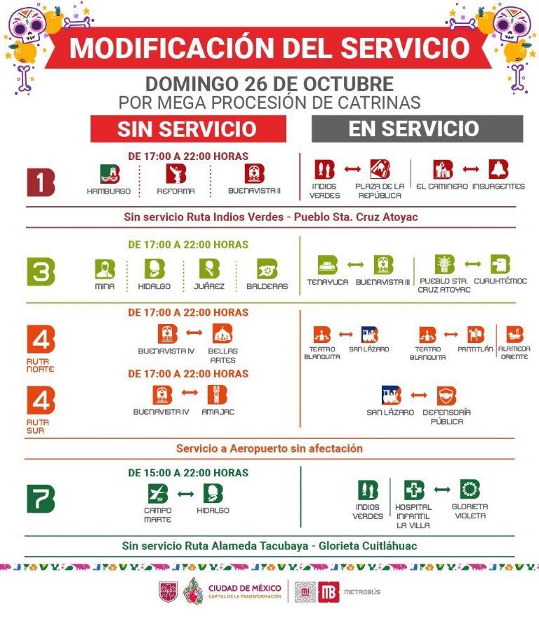 Las estaciones que el Metrobús cerrará hoy domingo 26 de octubre debido a la Mega procesión de Catrinas, son las siguientes, en un horario de las 17:00 a las 22:00 horas:
