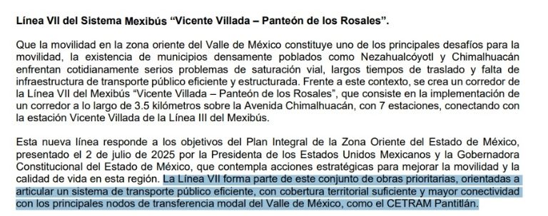 “La Línea VII forma parte de este conjunto de obras prioritarias, orientadas a articular un sistema de transporte público eficiente, con cobertura territorial suficiente y mayor conectividad con los principales nodos de transferencia modal del Valle de México, como el CETRAM Pantitlán”, menciona el documento.