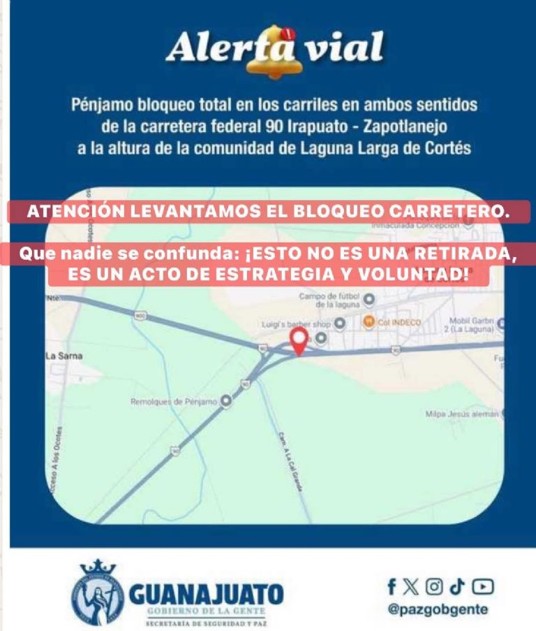 Sin embargo, el Movimiento Agrícola Campesino (MAC) anunció el levantamiento de los bloqueos carreteros en Irapuato-Zapotlanejo, a la altura de la comunidad Laguna Larga, mientras continúan las negociaciones con los tres niveles de Gobierno