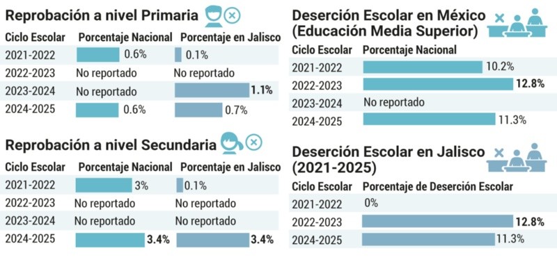 Sin embargo, en el ciclo escolar 2023-24, las reglas cambiaron nuevamente. La SEP estableció que los estudiantes de primero y segundo grado de primaria no pueden reprobar, pero sí los de tercero a sexto de primaria y de primero a tercero de secundaria, lo que ha ocasionado un aumento en las cifras de reprobación. En Jalisco, el porcentaje de reprobación en 2023-2024 fue de 1.1 por ciento.