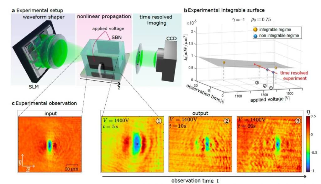 Para generar el solitón, diseñaron un sistema óptico que permite controlar con alta precisión tanto la fase como la amplitud del haz de luz. Esta capacidad era esencial, ya que la forma inicial del solitón debía ajustarse con gran fidelidad al perfil teórico previsto por el modelo KPI. Una vez dentro del cristal, y bajo las condiciones experimentales adecuadas, el haz mantuvo su forma y dirección sin deformarse, cumpliendo con las características esperadas para un solitón integrable.