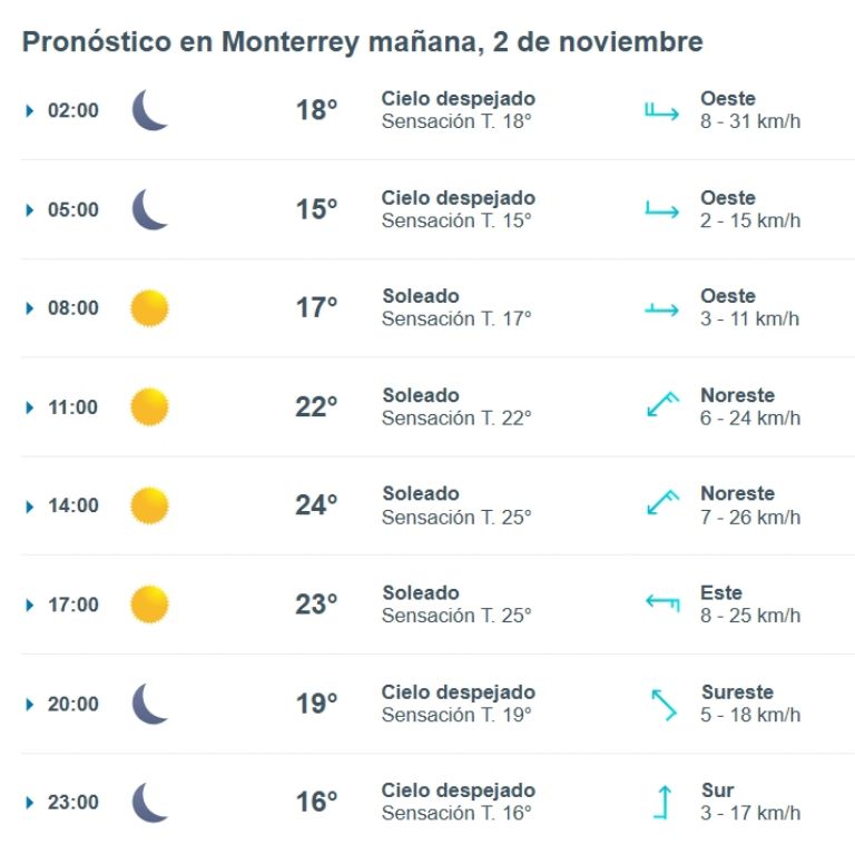 El final del Día de Muertos en Monterrey se proyecta con un clima agradable y un nuevo descenso térmico, pues la temperatura bajará hasta situarse alrededor de los 17°C al cierre de la jornada. El cielo tenderá a despejarse, con presencia de nubes dispersas, y la probabilidad de lluvia será nula; el viento del norte, aunque seguirá presente, disminuirá su intensidad respecto a la tarde, con rachas moderadas de 15 a 30km/h.