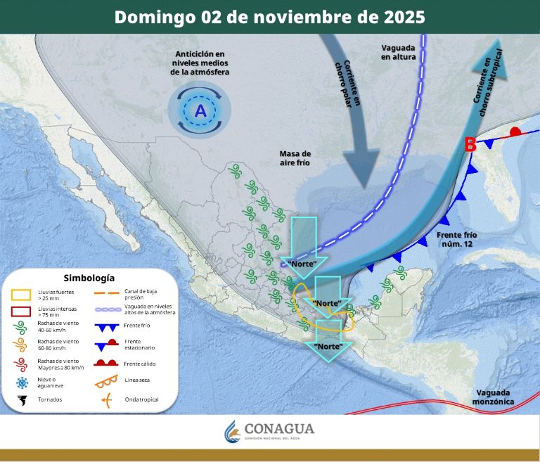 La característica más notable de la tarde será el incremento en la intensidad del viento del norte, con rachas que podrían alcanzar los 30 a 50km/h. Este aumento en la velocidad del aire, asociado a la masa polar del Frente Frío 12, conlleva un riesgo de formación de tolvaneras o levantamiento de polvo y tierra en zonas abiertas, por lo que se pide precaución a automovilistas y a personas con problemas respiratorios.