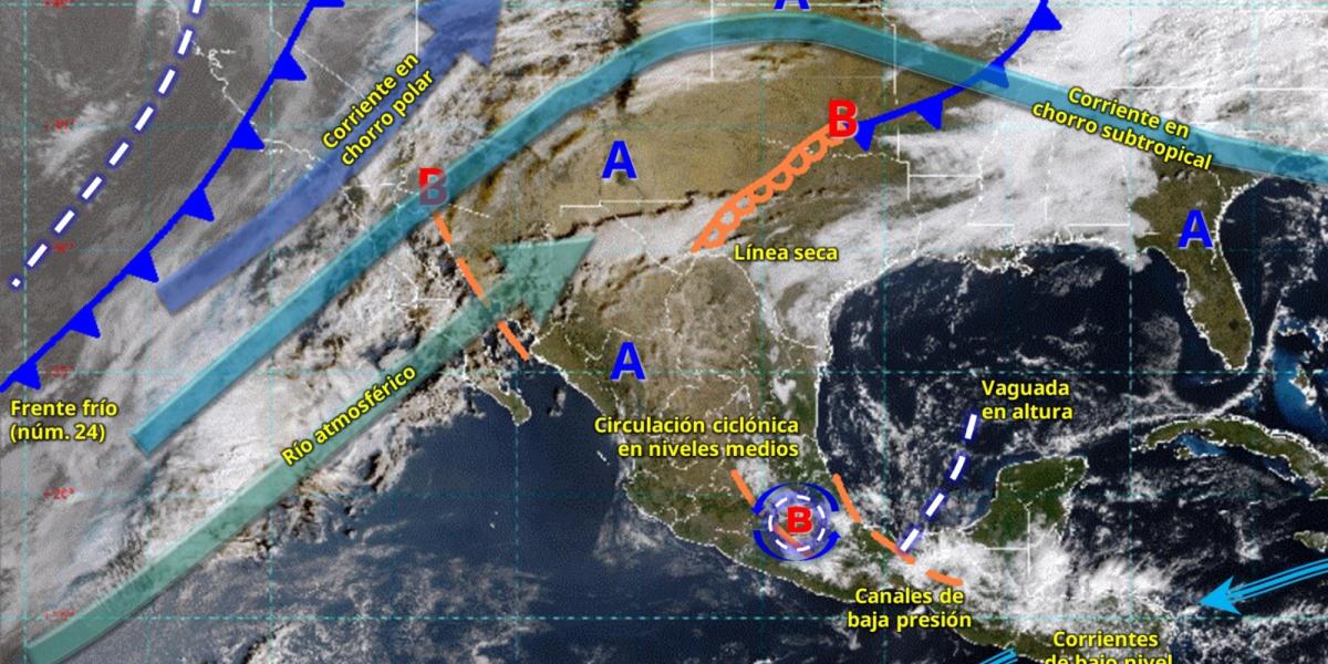 Durante el sábado, el sistema frontal se combinará con una vaguada polar y el aporte de humedad de un río atmosférico. Este patrón favorecerá lluvias fuertes en Guerrero, Oaxaca, Chiapas, Tabasco, Campeche y Quintana Roo; mientras que en el centro del país, incluido el Valle de México, se prevén chubascos dispersos.