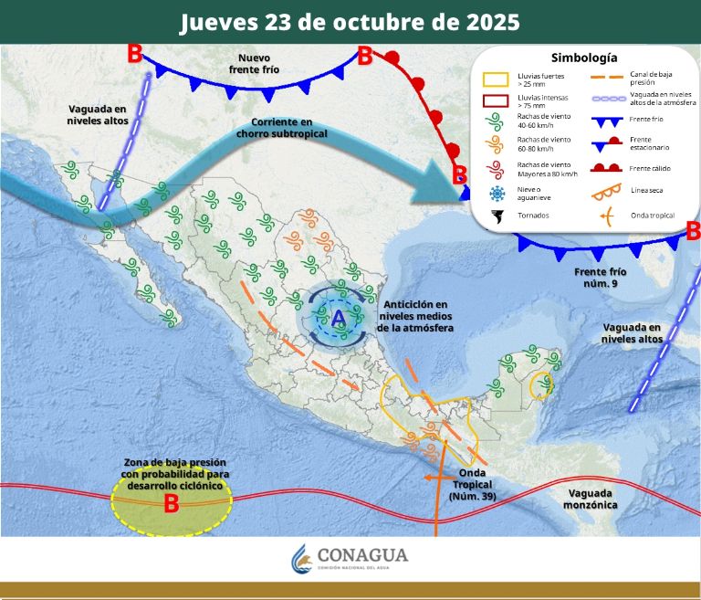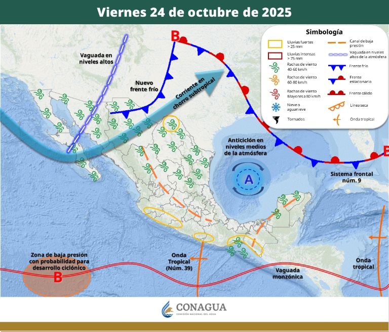 El canal de baja presión prevalecerá sobre el oriente y sureste de la República Mexicana, en interacción con una vaguada en altura, que se extenderá sobre la península de Yucatán y con los desprendimientos nubosos de la vaguada monzónica, próxima a las costas del Pacífico sur mexicano, además de divergencia, ocasionarán chubascos y lluvias fuertes a muy fuertes en las regiones mencionadas. Consulta el pronóstico completo a continuación.