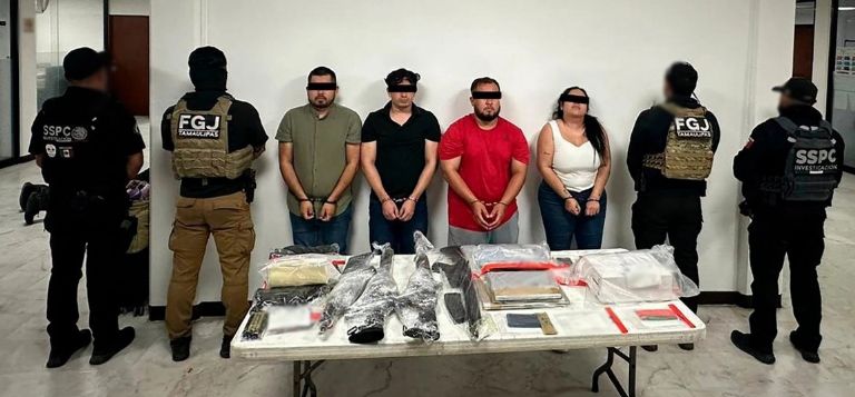 -En Matamoros, elementos de la SSPC, Semar, Ejército Mexicano, GN, FGR y Fiscalía del Estado detuvieron a cuatro personas, entre ellas una mujer, acusadas por los delitos de tráfico de armas, drogas y lavado de dinero, aseguraron siete armas largas, cargadores, cartuchos dinero en efectivo y un vehículo.