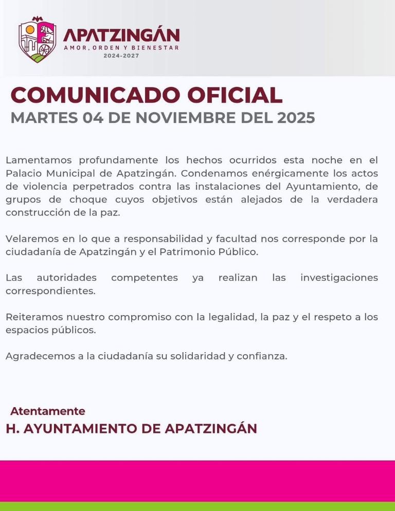 El Gobierno Municipal de Apatzingán emitió un comunicado oficial para lamentar y condenar enérgicamente los actos de violencia perpetrados contra las instalaciones del Palacio Municipal, durante la manifestación del pasado lunes, 3 de noviembre.