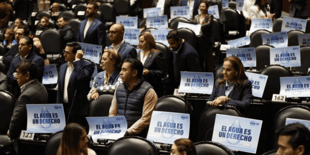 Legisladores del PRI subieron a tribuna con carteles que rezaban: “El agua es de todos, no de Morena”, “Morena quiere a los campesinos en la cárcel”, “Sin agua en el campo, no hay alimento en tu mesa”, “Morena odia al campo”, “El agua es vida, no botín político”.