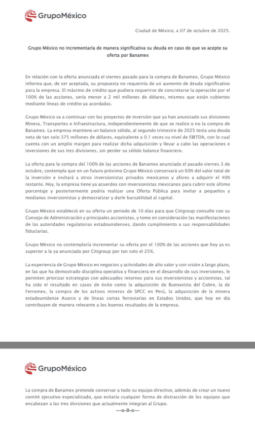 Grupo México informó este martes que, en caso de que se acepte su oferta por Banamex, la operación no implicará un incremento significativo de su deuda, ya que el financiamiento máximo estimado sería menor a 2 mil millones de dólares, monto cubierto con sus líneas de crédito ya autorizadas.