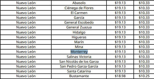 En el noreste del país, como en Monterrey, Nuevo León, el precio máximo aplicable del combustible, según la CNE, será de 19.13 pesos.
