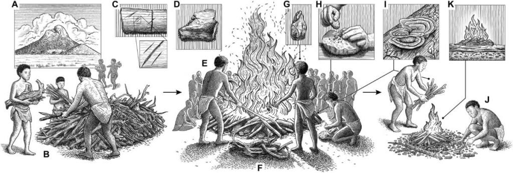 Ilustración del ritual funerario en Hora 1, desde la recolección de madera hasta la quema. Fuente: Science Advances